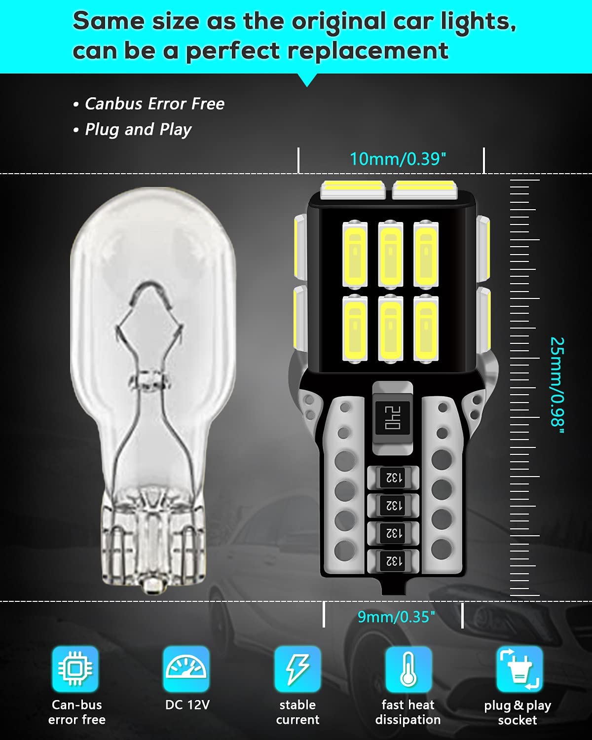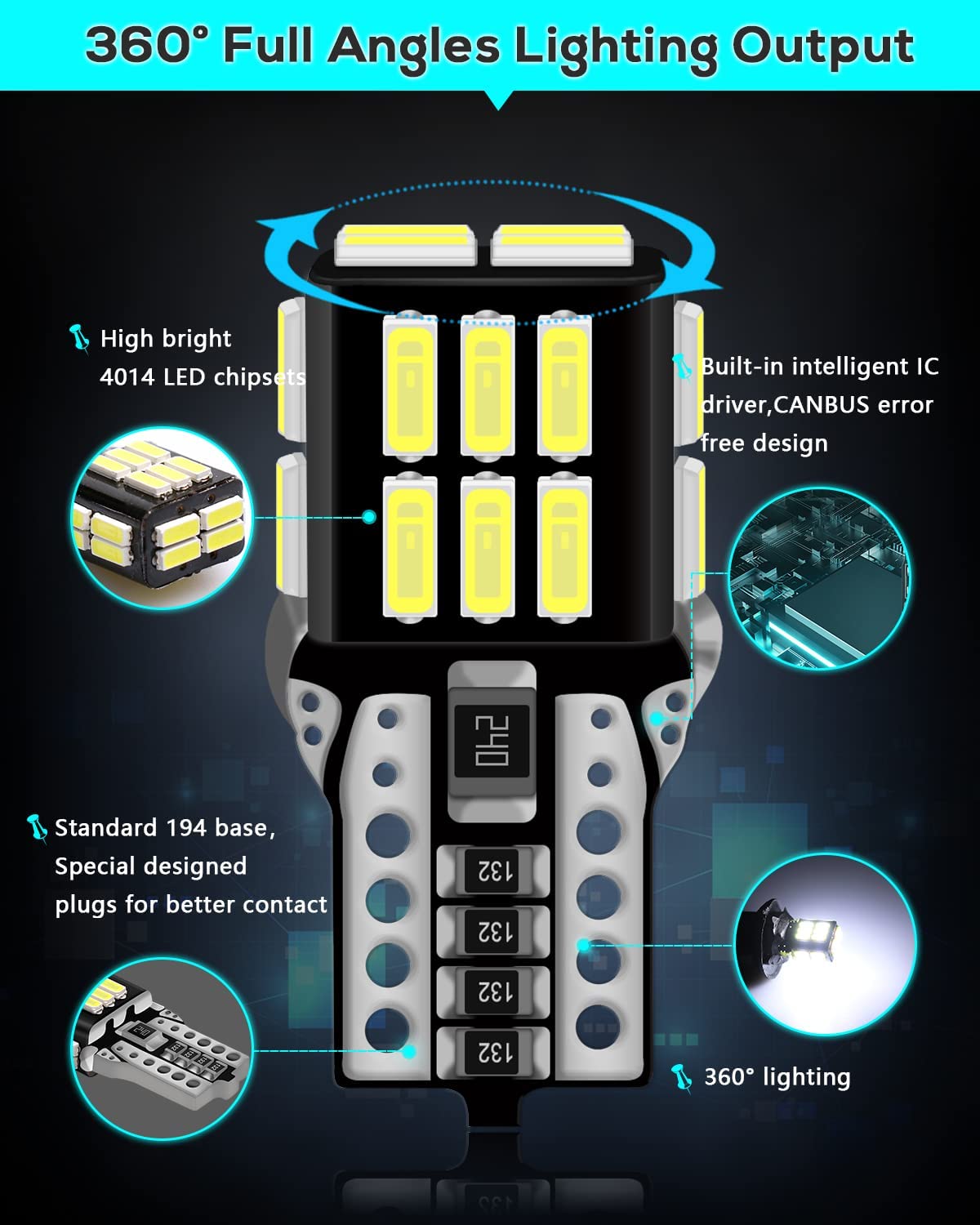 180Lumsブライトホワイト401424SMD LEDライトストック#194 168 158 2825 501 175 W5WバックアップライトマップドームマーカーライトナンバープレートライトCanbusエラーフリー、6個入りパック、DC12V。