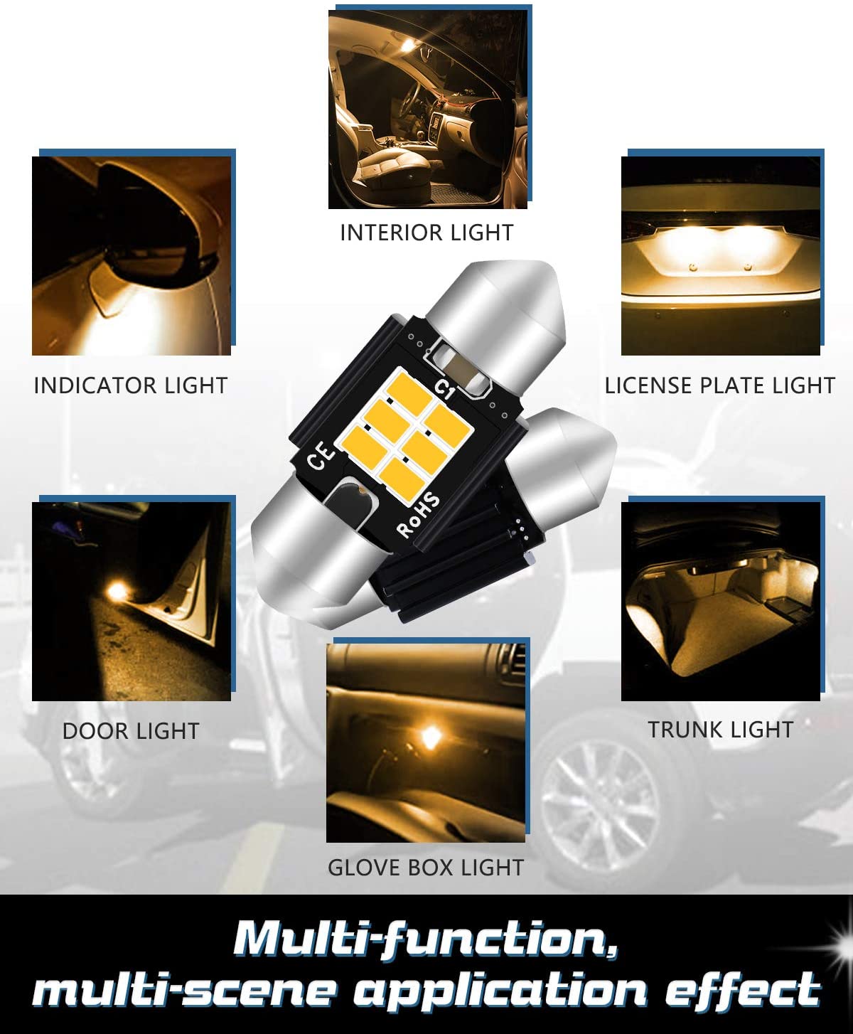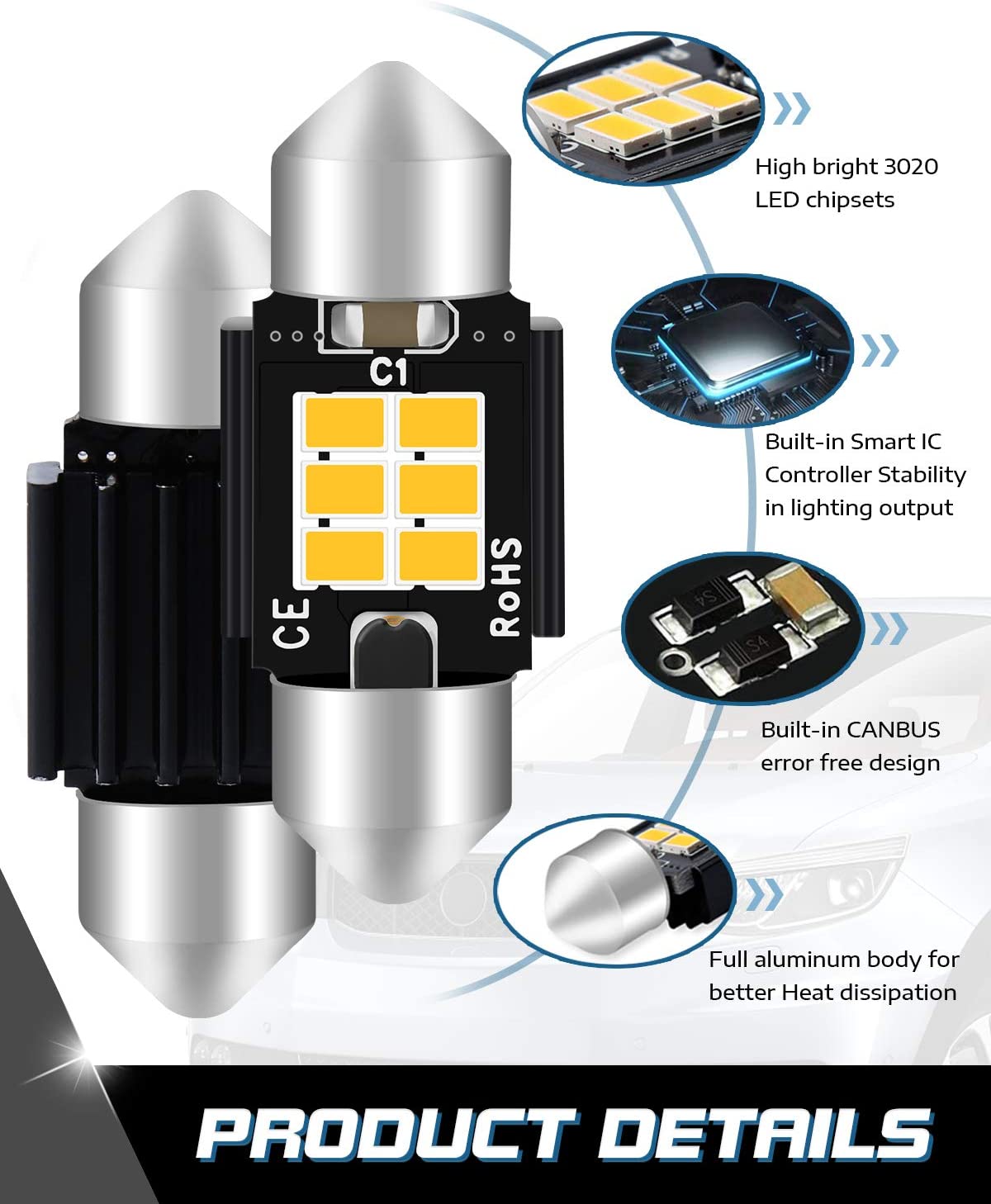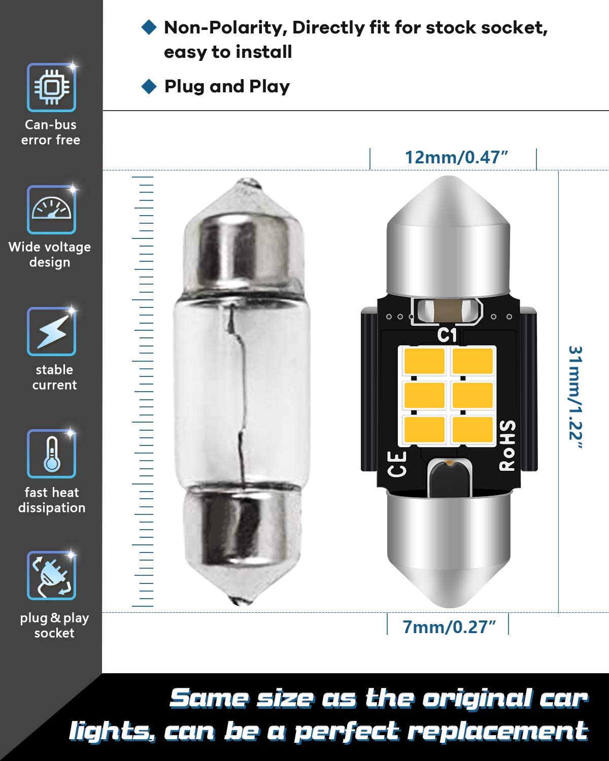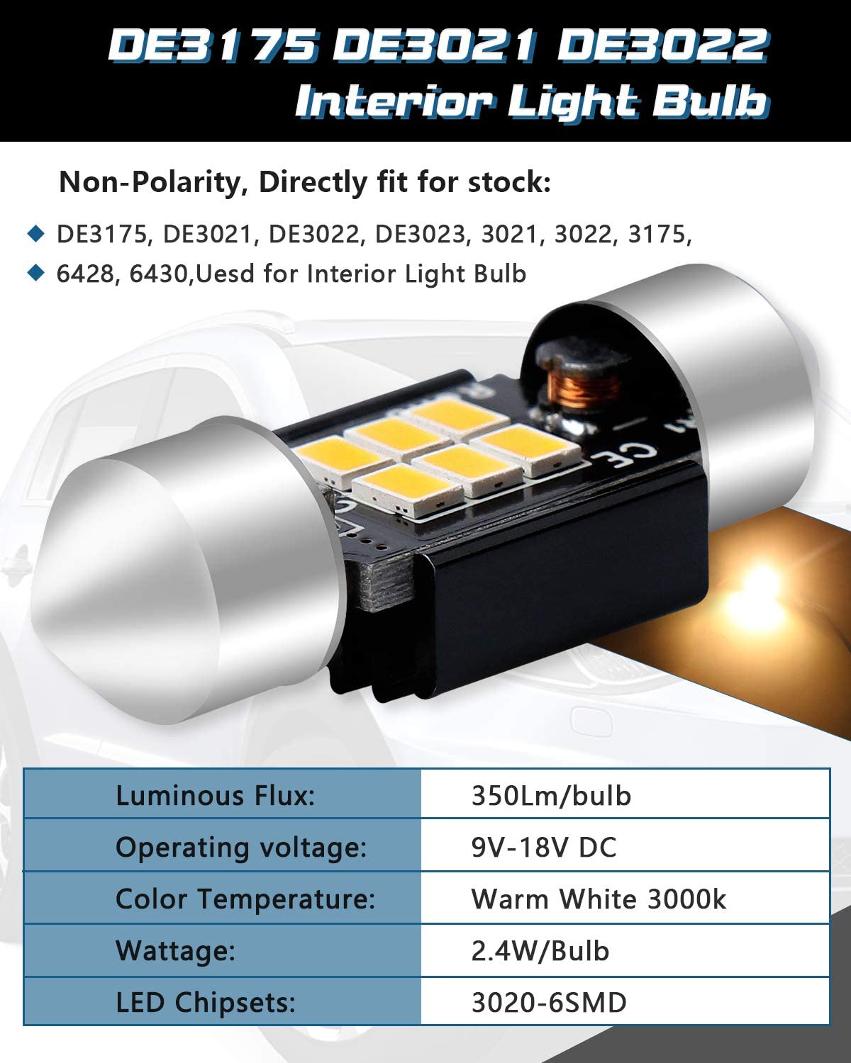 -ストック電球の代わり:1.25 "(31mm)LED電球は3021 3022 3175 6428 6430 DE3175 DE3021DE3022などに適合します。